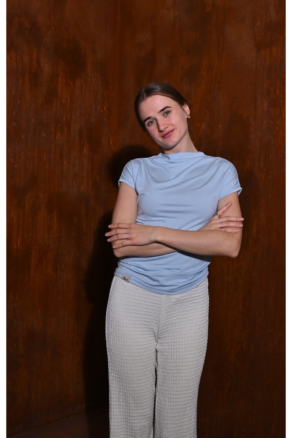 Světle modré tričko se stojáčkem je skvělým spojením elegance a pohodlí. Je ušito z kvalitního italského viskózového úpletu nižší gramáže. Tudíž se hodí především na léto.